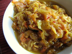 Three brownie points: Speaking for both dishes, this is a very healthy side dish. Pale green cabbage is unexpectedly nutritious, with Fiber, Vitamin K, even calcium and iron. It also practically disintegrates into neutral slivers of silkiness when cooked into the chutney. What a good way to hide a healthy veggie, in a sweet condiment.