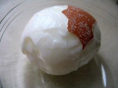 Turns out, in every case except peeling them hard-boiled. After mutilating the surface of the first egg I tried to peel (using all the cues in the book — peeling it under water, carefully trying to lift the shell along with the elastic membrane away from the silken white), I knew there had to be something wrong. A quick Google search reported that fresh eggs are “almost impossible” to peel. This is due to the acidity level in very fresh eggs that causes the thin skin of membrane to cling to the thin albumen layer of the egg white (check out a cross-diagram of an egg here — and I’d thought eggs were only whites and yolks!). Moreover, after a couple days in the refrigerator, the egg shrinks away from the shell a bit.
