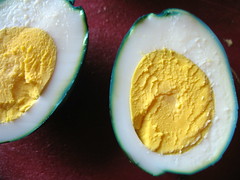 In the end, I’d say these yolk fillings looked prettier than their crater-faced, space-dyed egg white cups. I don’t have the guts to show photos of the worst-looking ones of the lot. Some of them were pretty terrible. What’s the deal, you can’t peel an egg? my friends would ask later that night, at an Easter house feast. WELL, and the anecdote about egg science began…