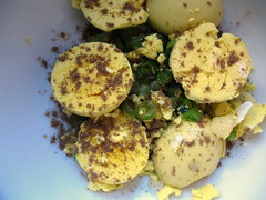 another egg-peeling tip that i always use, post-cold water bath, is gently cracking the shell all over, then rolling it between my hands until i can feel the membrane loosen. i believe i picked it up from The Joy of Cooking, and it works on even the freshest of eggs, straight from the farmer’s market. now if only i could perfect my timing, i wouldn’t blue the yolks 🙁
