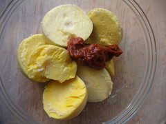 Blend yolks with the rest of the ingredients. Fill in egg white halves.