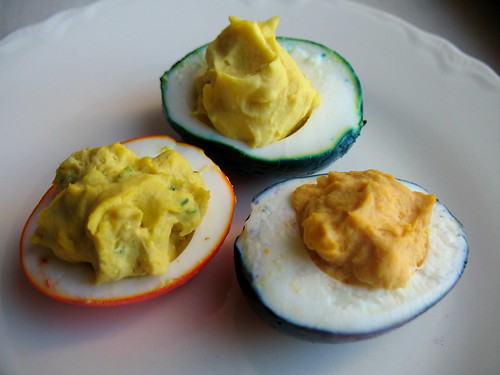ooh, deviled eggs! this reminds me of the Roy G. Biv deviled eggs from the second episode of Food Party. of course i doubt Cathy will be using Easy Cheese anytime soon..