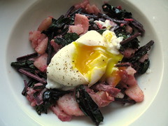 curried potatoes and beet greens with poached egg