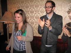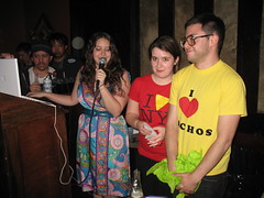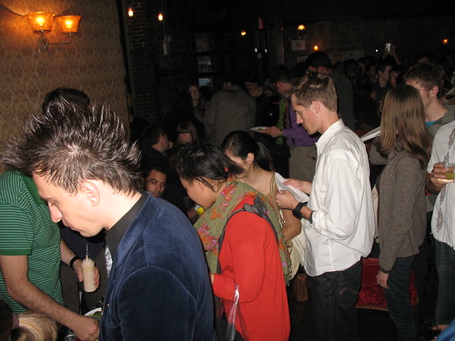 That, and I probably had more than my share of Tecate and Modelo Especial, a $2 special of the Cinco de Mayo-dated fete. I’m still feeling the repercussions. (And trust me, looking forward to the relative healthfulness of the Tofu Takedown this Sunday.) In any case, the event was hosted by the fine folks at Nachos NY, the site dedicated to the ebonic assertion of disownership and foodstuff otherwise known as tortilla chips. Commander-in-Chiefs Lee Frank and Rachel Anderson tapped New York City restaurants and home chefs alike to summon their ablest Aztec artistry. The result: ten contestants or teams of cooks, several gallons of free guac, and a line that wound around the once-spacious venue.