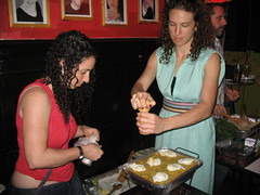 Despite their differences, these judges came down to their final decisions, finally. In the award for awesome risotto with “not enough poached eggs” was the unexpected effort by Arin Kramer and Alyssa Casey, whose “Urban Chicken Risotto” (#7) incorporated grilled leeks, gremolata, anchovy butter and poached eggs from the chickens that Arin and husband Ben raise in their own backyard. For that, they won a seat to dinner at Ted & Amy’s Supper Club — hopefully I’ll get to join them there. The judges also loved Eliza Ronalds-Hannon and Tali Biale’s squid ink risotto (#4) topped with a lemony squid, tomato and scallion salad, another adventurous and eye-catching risotto twist at the event, so they won a gift certificate to the Brooklyn wine shop, Thirst. The award for the best risotto adaptation of a Vicki Sue Robinson song went to Laena McCarthy and Livia Manfredi’s beet and raspberry jam risotto (#2) with balsamic, aged goat cheese and orange zest (I might add that the only person who got the reference to “Turn the Beat Around” in the crowd at first was Cupcake Takes the Cake blogger Nichelle Stephens). Be on the lookout for Laena and Liv’s artisanal jams at shops like The Brooklyn Kitchen this summer. They won a covered saucepan from Scanpan, “perfect for jam.” Eve Dilworth’s “NY State Strawberry Rhubarb” risotto (#13) impressed the judges with its creamy, mascarpone-infused texture and fresh strawberry-rhubarb topping, so she earned a subscription to Diner Journal. The judges gave Vince Trotter and Scott Lachut’s “Bicoaster Bearded Efferevescence” risotto with fennel, pancetta and jasmine tea (#8) a thumb’s up with a stash of Mast Brothers Chocolates, “because the Mast brothers also have beards.”