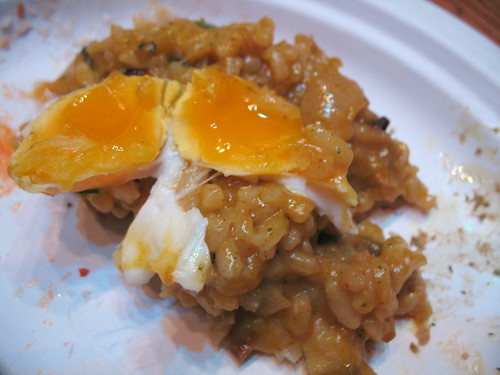 But everyone wants to know one thing: who won? Well, there’s lots of answers to that question, as lots of people won something. Those that for some reason didn’t make the cut included ones that were some of my friends’ favorites: Ricky Silver’s fresh mango and goat cheese “salsa” risotto (#3), Marsha Nicholson’s “Risotto di Farro con funghi porcini e due pesti” with ramps, walnut and aged gouda (#4), Jason Anello’s “Poor Man’s Risotto” with monkfish, zucchini and a “secret spice” (cardamom!) (#11), Jaime McCallum’s “Solidarity Forever” risotto with fiddleheads, mushrooms and butternut squash, and Roxanne Aubrey and Peter Marina’s “New Orleans Crawfish Etouffee” risotto (#12), with all that goodness and more. I don’t think these guys need to be reminded from the many plates scraped clean how great theirs were, but in case they do, keep your chins up, kids — you done good.