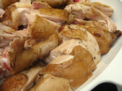 Two maple leaves: This dish is just chicken, with some ingredients used to season it. As admitted, the one I used was none too local nor humanely raised, but the two brownie points are intact for actually purchasing it whole; most of the chicken meat sold in the US are oversized breasts, boneless and skinless. The way I see it, this lends to a disconnection between the consumer and the animal he or she is consuming, and the cut preference responsible for the practice of plumping up the breasts of the chickens to the point that many are too off-balance to walk just before being slaughtered.