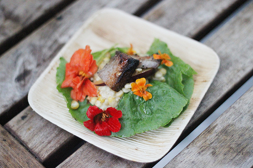 Because the event was all about local food, each contestant stepped up to the mic to introduce their dish and tell which farms they got their ingredients from. So, aside from said rooftop farms for the flowers, my corn was from Maxwell’s Farm, via Union Square Greenmarket. Black plums were from Red Jacket Orchards. The pastured, all-natural pork belly, from Mountain View Farm. Basis Farm to Chef is the thoughtful provider who’d hooked me up with their meat, a business that does exactly what its name sounds like — facilitate access to farm-fresh food for chefs. Collecting all that lettuce was an interesting feat. When the Williamsburg Paisley Farm CSA drop-off location found itself with bushels of leftover romaine, I was in the right place and time to take as many as I could hang on my handlebars home. (The CSA chapter has since figured out a way to donate leftover produce to City Harvest, but people foregoing their lettuces hadn’t been a big problem until then.) Then, I scored another hoard of romaine from Garden of Eve farm’s post-market day stash. When the scavenging was complete, I had around sixteen heads. Freeganism!