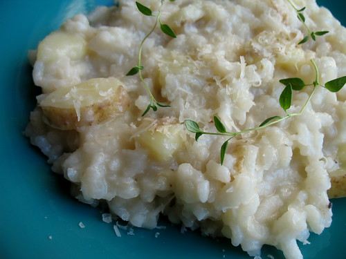 Four brownie points: My mother is shaking her head again right now. True, this starch-only risotto is not a well-balanced meal in itself, though it might be tasty enough to treat it as such. But potatoes have a lot of potassium and other nutrients, including some Vitamin C, surprisingly enough. Start thinking about making a more nutritionally dense, mother-approved sweet potato risotto come the fall, when they’re in season.