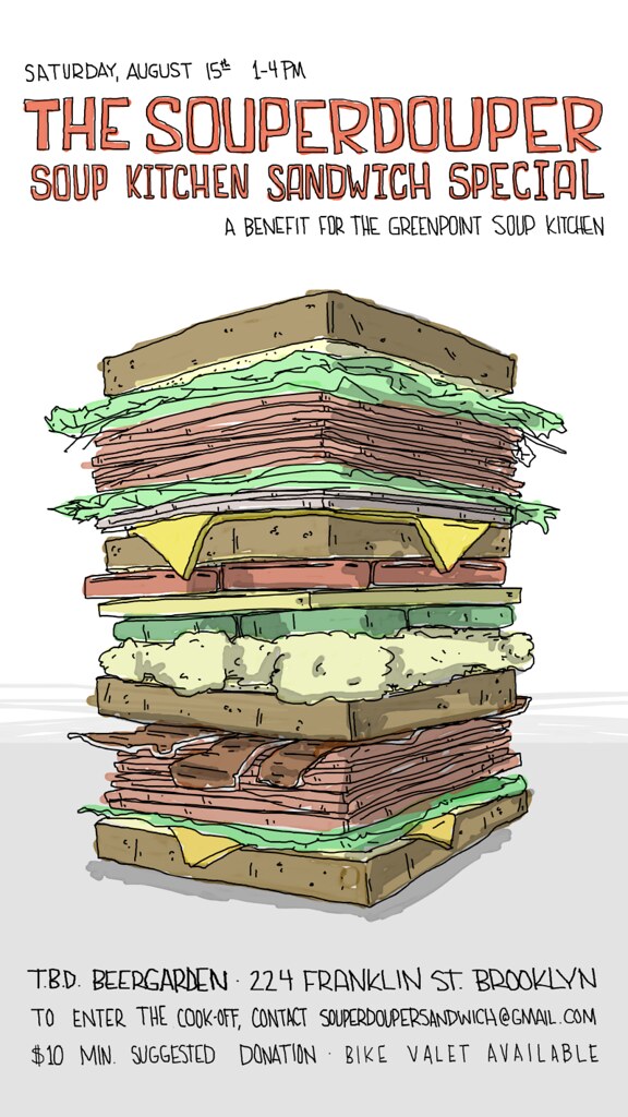 The winner will be decided by a panel of judges, which includes staff from the Greenpoint Soup Kitchen. An audience favorite award will be handed out, but the first-place winner with the judges will be crowned the head chef at a later volunteer day at the soup kitchen, just down the street from t.b.d. This head chef need only supply his or her time and sandwich-making mastery at the volunteer day. Prizes will be presented to winners, too.