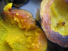 Preheat oven to 400 degrees. Slice the squash in half and scoop out the seeds and pulp with a spoon. Save for another use or discard. Spread about 1 tablespoon vegetable oil on the bottom of a roasting tray and place the squash halves cut side-down on the tray. Roast for about 30 minutes, or until the flesh feels soft when poked and it has shrunken away from the skins a bit. Flip over and let cool. Once cool enough to handle, scoop out all the flesh and reserve in a bowl.