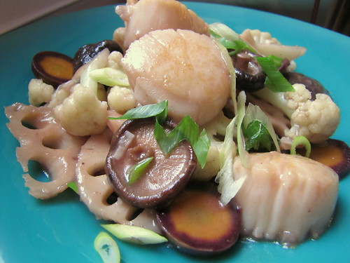 Why blog about recipes that are already published anyway? If this dish sounds a little non-intuitive at first, one way of de-mystifying it might be to think of the Japanese rice wine, sake, as European white wine. They’re great for cooking with seafood, either one. This dish is not beholden to any of the vegetables, either — certainly not the crazy red carrots I had, since they stained the entire dish with a purplish tint. But the lotus root adds a distinct, crunchy texture as well as unique visual appeal. Quickly cooked, they’re neutral-tasting, with the crispness of water chestnuts, or a raw potato with much less starch.