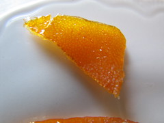 Bring orange halves to a boil in a small saucepan. Drain, and fill again with fresh water. Repeat process four times. Remove orange and let cool. Slice into quarters and scrape away the pulp and white pith from the zest; get as much of it off as you can without tearing the peels. Slice peels into fine chiffonades (note: in the photos above I went ahead with the next step without slicing them as indicated; I think it’s better to slice here rather than at the end).