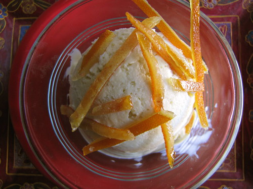 I actually meant to finely slice the candied orange peel when it was finished and sprinkle it into the ice cream as it was churning in the machine. But I forgot to when that was happening. So here it’s used as a garnish, and you can use these shreds as garnish in many other things: toss them in salads for a chewy-sweet touch, or put them in homemade granola or trail mixes. I’ll probably be doing many of these things in the aftermath, thanks to my oversight. That, and eating lots of egg whites (reserved from the yolk-separating task). I’ve been dropping them into hot soup a lot lately.