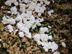 Start by cooking your dry grains, both the freekeh and bulgur, in separate pots as they’ll have different cooking needs. I found that a cup of bulgur to two cups of water, simmered covered about 20 minutes or until all soaked up, cooked it just perfectly. For the freekeh, which are larger grains, a cup of that to three cups of water worked out the same way. Let these cool uncovered a while; also, stir them up a lot as you do so that it gets to air out and separate. Now they’re just chewy and dry enough to coat with olive oil and combine with other ingredients in a pilaf. Since it’s winter, I went with roasted squash as the main addition to this one.