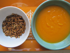 So we concentrate the butternut squash, first by roasting it for quite long, until sticky and caramelized at the surface. Then, to smooth out its consistency so that it’s not plain butternut mash but a lappable soup, let’s add the concentrated juices of other vegetables we love, too, in liquid form (aka vegetable stock), and to heighten its natural sweetness, just a touch of local bees’ honey. And that’s all this soup really is. A concentrated blend of your favorite juices (not unlike the stuff in a can you helped your mom to “make” orange juice out of as a kid — that might be a fun project, though, making condensed cans of frozen squash soup), and honey. And, some crisped seeds from the squash itself — it’s amazing how one squash produces just about as many seeds to flesh as you’ll need to garnish a soupful of it (and now, if only there were some good uses for its rather unpalatable, leathery skin).