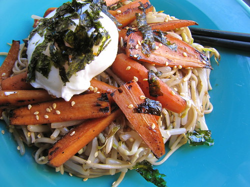 Meanwhile, boil the soba noodles following the directions on the package. Drain. Also meanwhile: poach the egg by bringing a small pot of water with a splash of vinegar to a boil. Remove from heat, and carefully slip in a cracked egg. Cover, and let cool for 3-5 minutes. Alternately, you can fry an egg sunny side-up or over-easy instead.