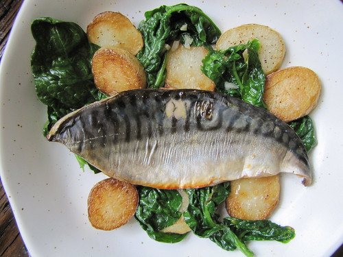 After six hours of marinating, the acidity in the vinegar should actually cook your fish a little, and it’ll feel firmer. Now they just need a little time under the broiler on each side. White potatoes and spinach looked nice at the market that day, and round out the dish for a quick, simple meal. Any leafy green — baby bok choy, kale — works fine, too, but since mackerel is so assertive the benign spinach seemed like a good match.
