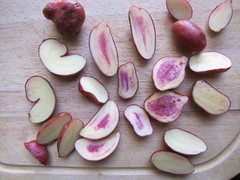 I knew from the start that I wasn’t going to strive for exact replication, but try to translate this dish using my home cooking tastes and tendencies. Which is local, seasonal, and as sustainably, naturally, humanely produced as possible. Following these standards I can’t guarantee exactitute, but I can guarantee deliciousness. It just works out that way, most of the time. Take for example these heirloom fingerling potatoes, at Berried Treasures’ Union Square Greenmarket stand. An unexpected find, these pebble-shaped, baby potatoes were promised to be red both on the inside and out, and “creamy” in texture.