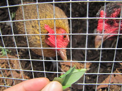 beaker and MeiMei, two of the heritage hens, peck at pea shoots